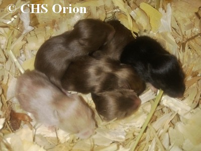 První den mají křeččata sytě růžovou barvu, jsou zcela slepá, hluchá (uši velmi přitisknuté k hlavičce), bez srstí a tím pádem neschopná vlastní termoregulace. (zahřát se a udržet tělesnou teplotu). Nedokáží ani sami vylučovat - masáží bříška jim pomáhá matka. U černookoých jedinců jsou vidět černé tečky v oblasti očí, pokud budou očka červená, nejsou téměř vidět. Nekoordinovaný pohyb.